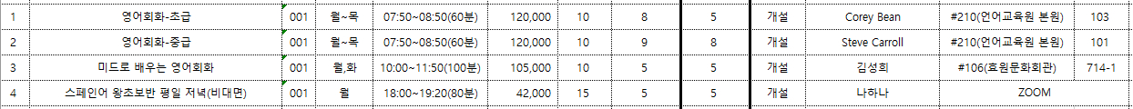 - 개설 강좌 외에는 수강 인원 미달로 폐강되었음을 알려드립니다. (폐강강좌 수강생에게는 유선 개별 안내)